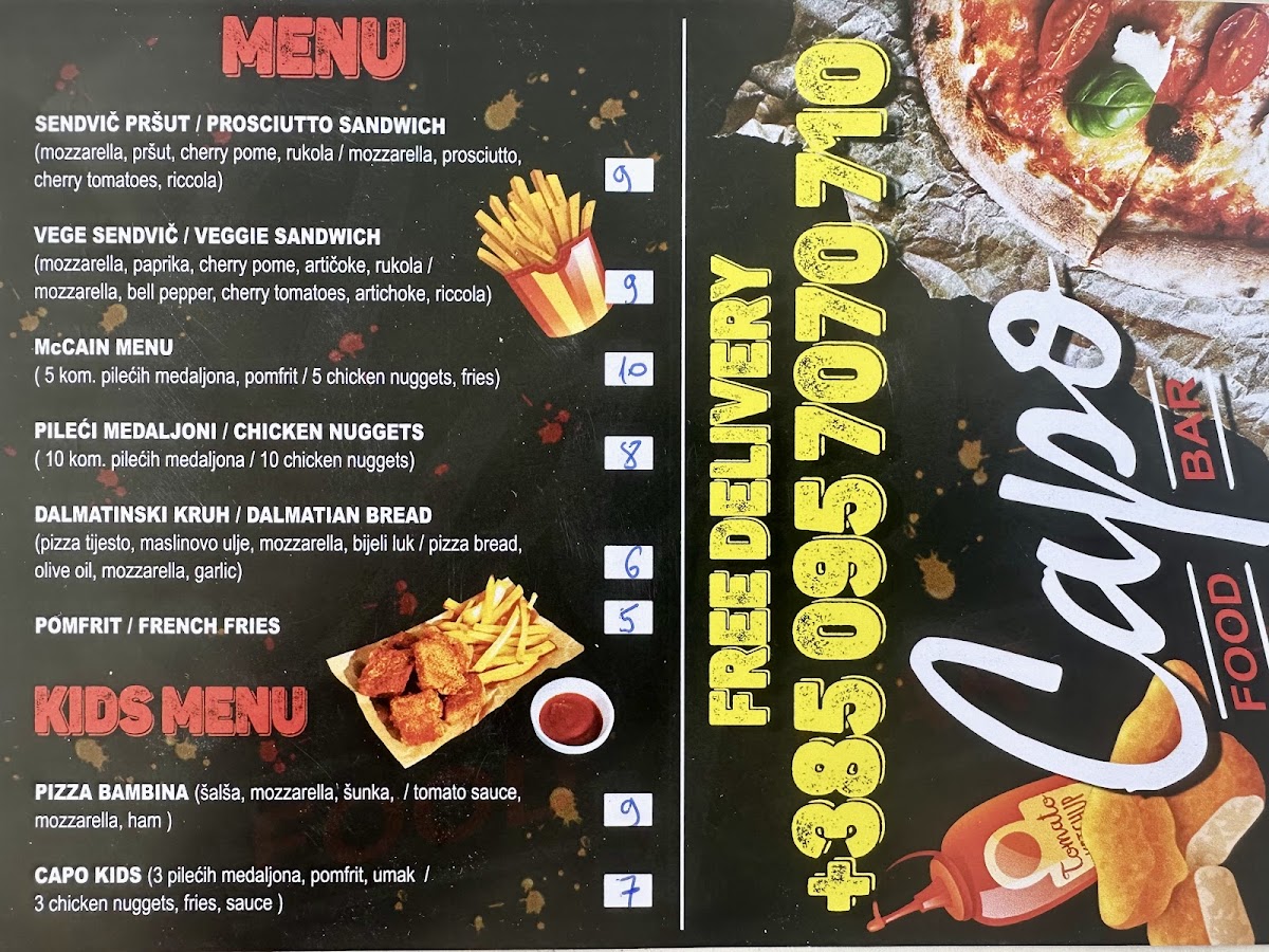 Welcome to FAST FOOD & PIZZA “CAPO”, a charming spot located on the beachfront in Okrug Gornji, Croatia. This delightful eatery specializes in thin-crust pizzas that are not just tasty but also incredibly affordable, with veggie options starting at just 60kn. The welcoming atmosphere, complemented by friendly service, makes it an ideal choice for a quick lunch or dinner by the sea.